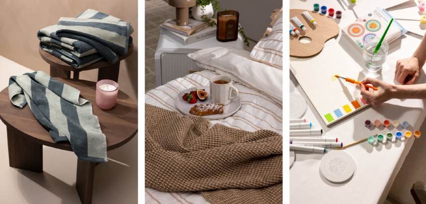 A self-care night is the perfect way to escape the everyday rush and relax with mom. The evening resetbegins by wrapping up in plush Stripe Cotton Bath Towels (₱530) after a good bath, perfectly pairedwith a warm cup of tea or coffee served in the elegant Petal Mug (₱160). With the calming scent of a Floral Orchard (₱350) or Sandalwood Musk Reed Diffuser (₱350) and the warm glow of a Selfcare Glass Candle (₱350) lingering in the air, the room is instantly transformed into a quiet sanctuary. The night beautifully closes out by reflecting on the day with A5 Hardcover Journals (₱290) and slipping on aBodycare Eye Mask (₱130) for a more comfortable night’s sleep, creating the ideal ambiance toappreciate every quiet moment with loved ones.